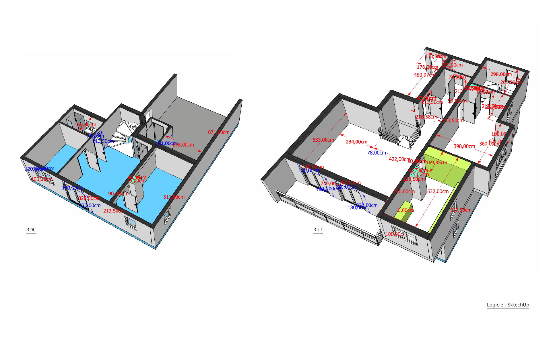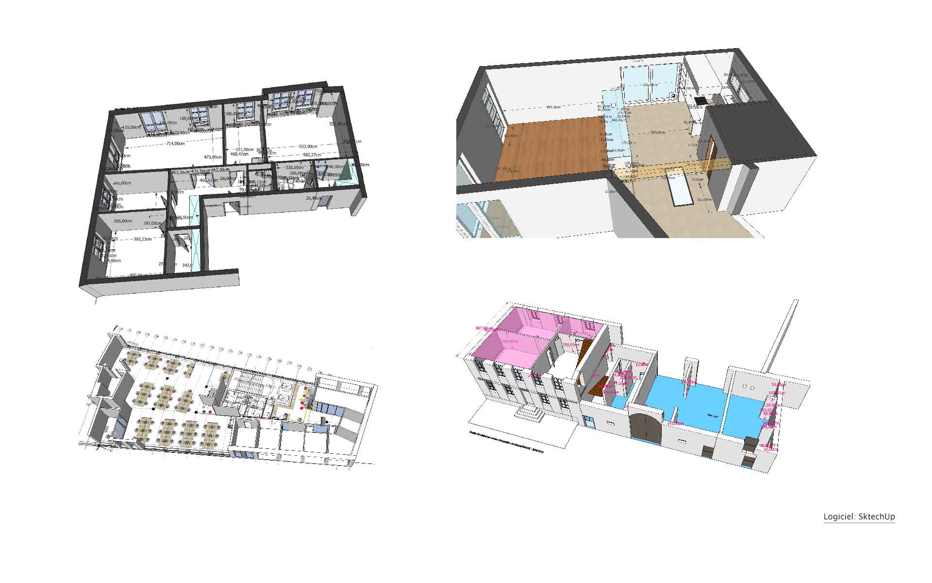 Logiciels: AutoCAD, SketchUp, VRAY, Photoshop, InDesign, Office